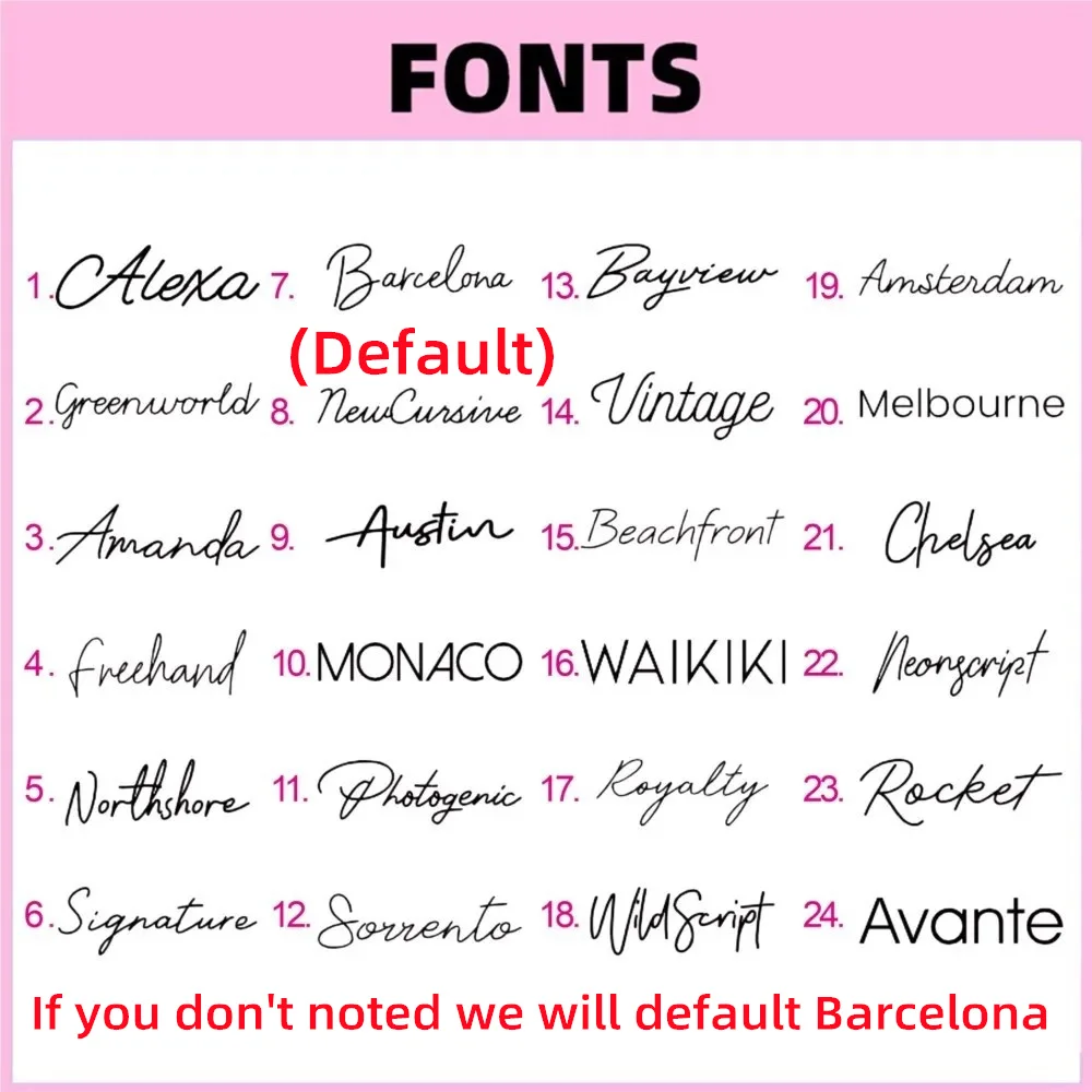 (We will default the color pink and the font Barcelona when you don't note. Thank you.)