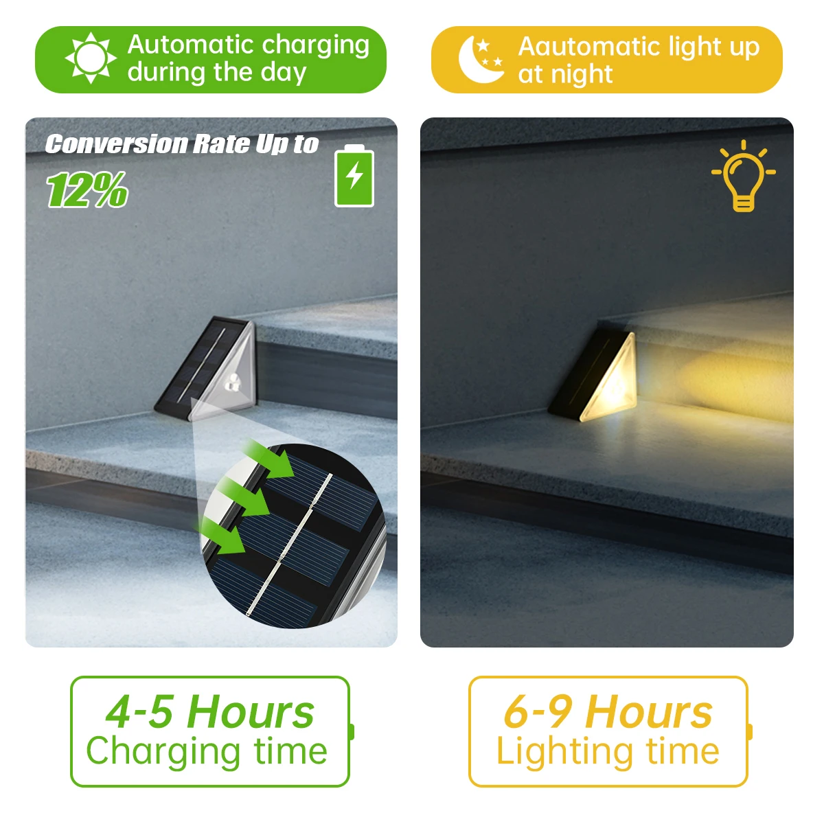 【𝙎𝙤𝙡𝙖𝙧 𝙋𝙤𝙬𝙚𝙧𝙚𝙙 𝟴𝙃 𝙇𝙞𝙜𝙝𝙩𝙞𝙣𝙜 𝙏𝙞𝙢𝙚】-- The solar stair lights with 800mAh polycrystalline rechargeable battery, it can illuminate more than 8H after fully solar charged. With Built-In light sensor, the solar panel will automatically charge during the day, and the light will automatically turn on at dusk and off at dawn.
