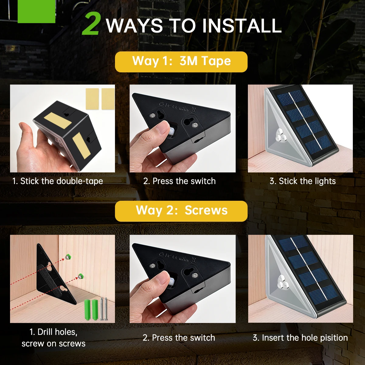 【𝘽𝙧𝙖𝙞𝙣-𝙙𝙚𝙖𝙙 𝙨𝙞𝙢𝙥𝙡𝙚 𝙩𝙤 𝙞𝙣𝙨𝙩𝙖𝙡𝙡】--Outdoor solar step lights with no requirement of wires, and includes both stick tape and screws, 2 install way for your choice: ① Directly attached to the stairs by 3M back glue. ②It comes with screws and bolts; you can easily fix it in the stair. Tips: It need to be installed in a sunny spot.